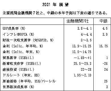 99年1月のレアル切り下げによる混乱回避のため、45%まで引き上げられた基礎金利Selicは、99年末には19%まで引き下げられていた。 2000年に入ってからも、原油価格上昇は継続、更に米国経済の先行きに対する不透明感、株価の変動、年後半のアルゼンチン危機の深刻化、トルコ危機の発 生など海外情勢の不安定要因のため、中銀は慎重な金利政策の運営を行った。しかし、国内経済の良好なパフオーマンスにより、2000年は年間5回の引き下 げを行い、15.75%と1986年クルザード・プランいらい最低の金利水準で越年した。