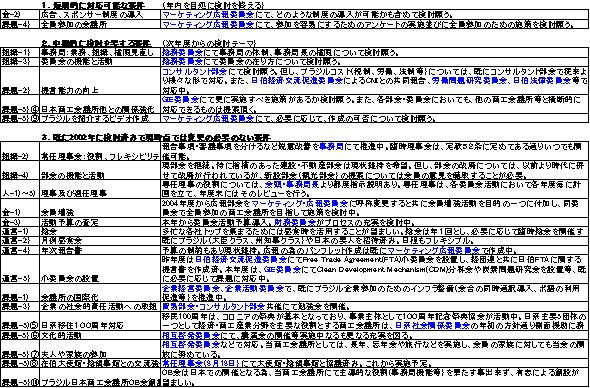 ⑤ 2008 年の「移民100周年」はコロニアが主人公であることは言うまでもないが、同じ船に乗るものとして、またコロニアの方々が築いてきた過去の業績によって大 いに恩恵を受けている会議所としても、オール日本という発想を持って、もっと協力・支援する必要性がないのか。2008年に向けて、会議所としてのプログ ラムを考えなくてもいいのか。2008年には、日伯関係は、間違いなく好転していると思われるので、何もしないと禍根を残すことになろう。