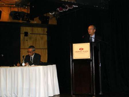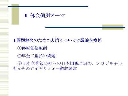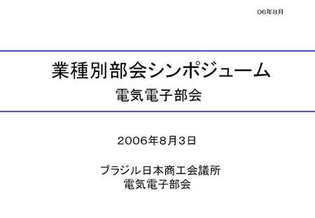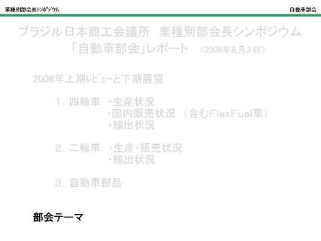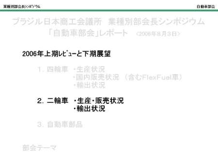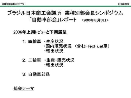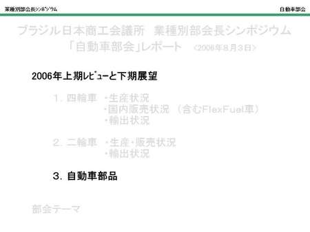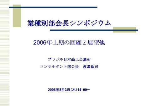 金融部会の福田でございます。金融部会はちょっと、今のコンサルタント部会のようになかなか格好いいプレゼンテーションができなくて、伝統的にまあグタグ タと説明しますので申し訳ございません。2006年上期の回顧でございますけども、もうすでに何回か繰り返されていることなんですけども、まあ特にその、 金融市場について申し上げますと、2006年上期というのはですね、2004年以降世界経済の拡大で順調に推移してきたブラジル経済がですね、初めて経験 する試練の時期であったと言えると思います。