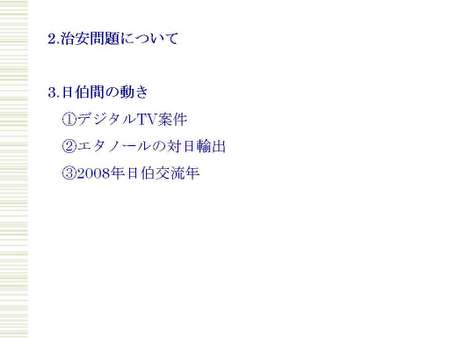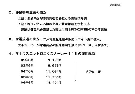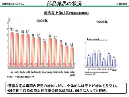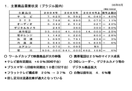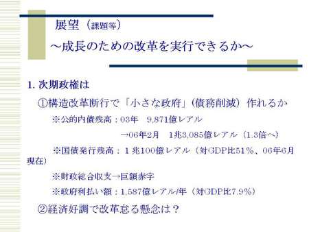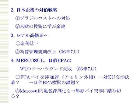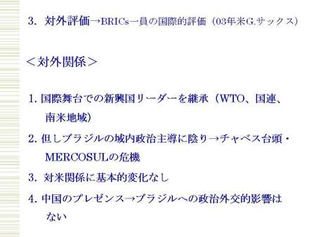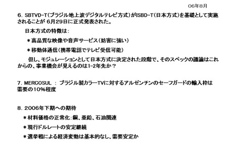 それからまあ日本におきましては2001年来超金融緩和政策が続いておりましたけれども、今年の3月には量的緩和政策が解除されて、7月には公定歩合引き 上げという形でついにゼロ金利政策が終了しております。今後のブラジル経済を占う中ではこのような外部環境の変化というのはやはり注視していく必要がある と思います。