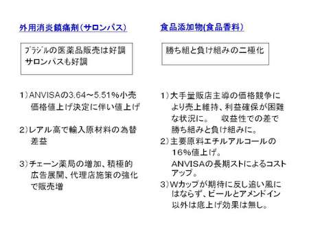 為替については現在対ドル2.2ぐらいなんですけど、政府としてはこの辺の数字というのは比較的そのまあ居心地の良い数字なのかなと。まあやはりインフレ が低く抑えられるというメリットがあります。好調な輸出や、ブラジル国内国債市場の非居住者への開放ということがあり、まあかなり外貨が流入しておるとい うことでですね、まあマーケットでは引き続きドルの余剰感というのは強うございまして、引き続き若干レアル高傾向かなと思ってます。