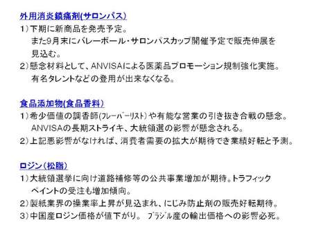 残念ながらSelicについて言いますと、まあ四行、これは日系の銀行が二行とブラジルの銀行が二行なんですけど、Selicの低いところが14%、高く て14.25と。それから為替について、対米ドル・レアルについていいますと、一番高いところが2.15、一番低いところが2.25と、きわめて現実的な 範囲に収まっておりまして、あまりバリエーションはないと。