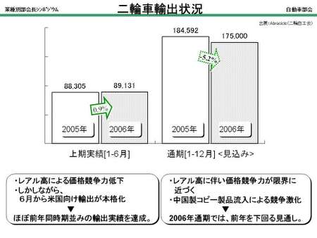 2006年上期(1~6月)の輸出は前年同期比13%増加して609億ドルに達し、レアル高の結果輸入は414億ドルと22%増加したものの、経常黒字は昨年並みを維持。