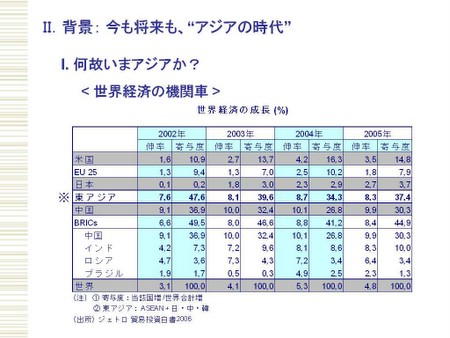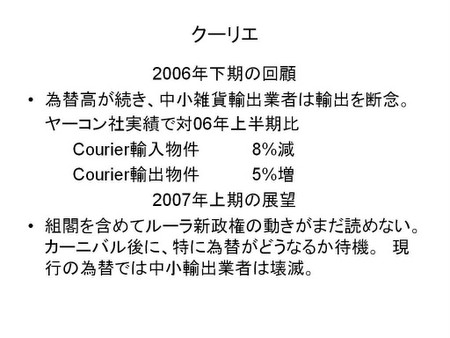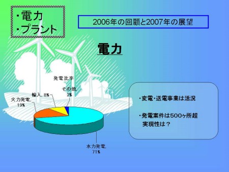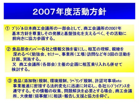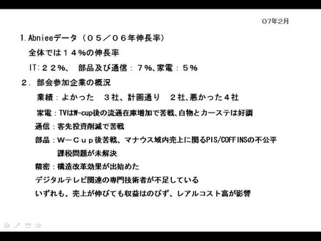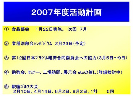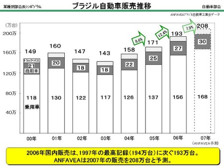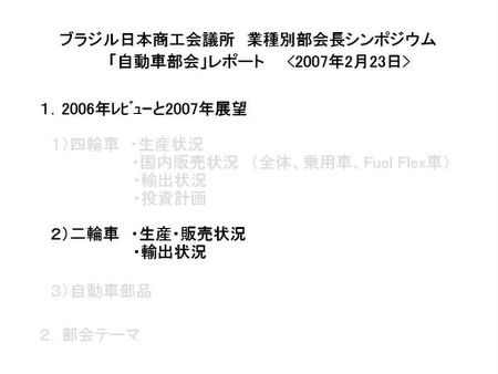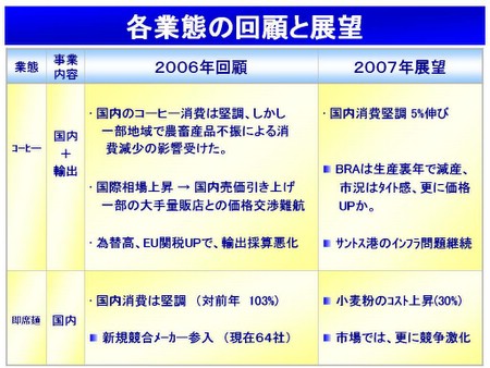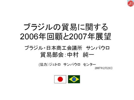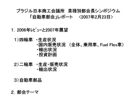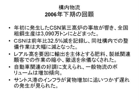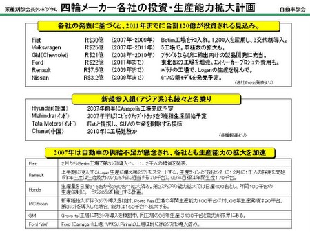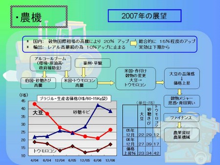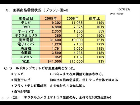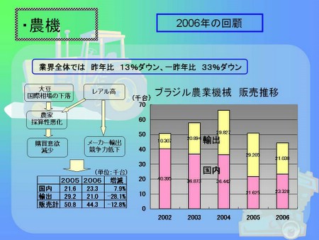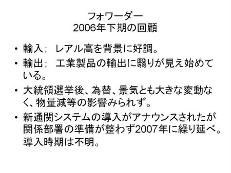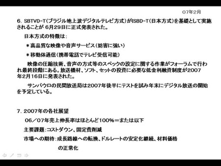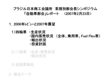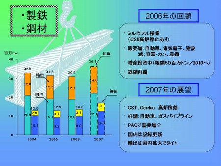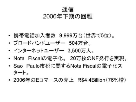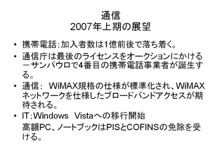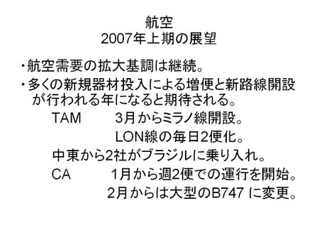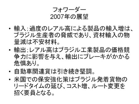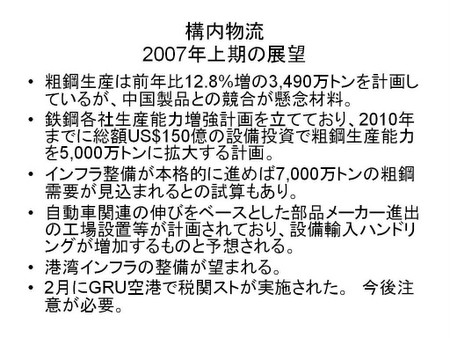引き続き2007年の展望でございますが、今年の最大の 注目点、これは当然二期目のルーラ政権の経済運営ということになります。目玉としましては、1月に発表された例の成長促進プログラムのですね、まあここに ありますように、より大きな投資を通じてGDPの成長、これを刺激するという目的があるわけでございますが、まあ一般的に言われていることは減税措置への 失望感、それからシナリオの実現性ですね。