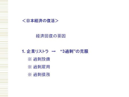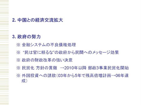 これの疑問が非常に出ておると、財源はどうす るんだということで、必ずしも市場の評価はそれほど高くなっていないと。したがって今年の金融経済動向としましては、このプログラムの動向をもちろん見て いかなきゃいけないのですが、引き続き外部要因、いわゆる米国経済の状況あるいは中国の経済成長の持続性、こういった外部要因を十分ウオッチしていかない といかんという状況だと思います。