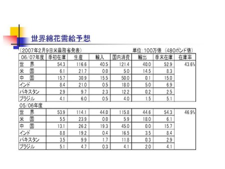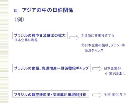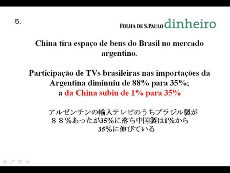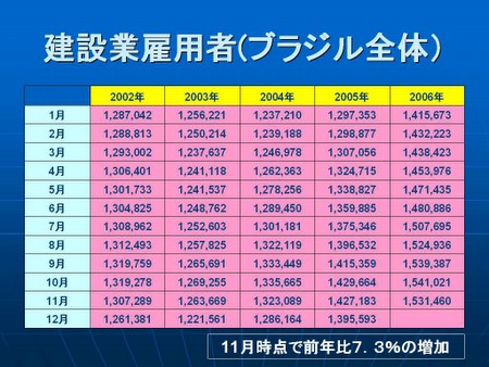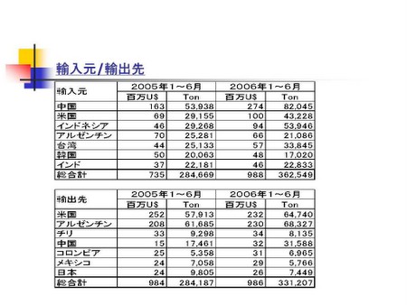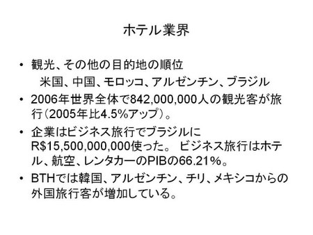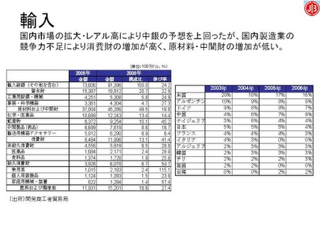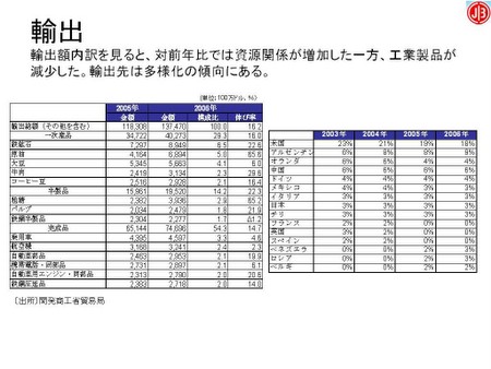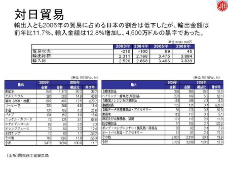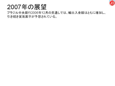 それから貿易収支でございますが、輸入は当然レアル高が続き ますので、まあ20%以上の伸びが予想されますが、一方輸出もですね、引き続きましてコモディティ価格、これは高止まりという状況でございますので、金額 ベースでは10%程度伸びるだろうということで、昨年にはおよばないものの、390億ドルくらいの貿易黒字、これが出るだろうということですね。