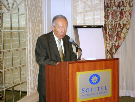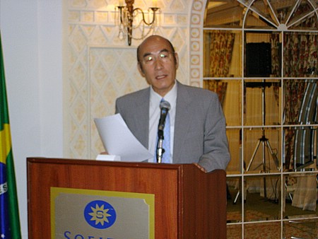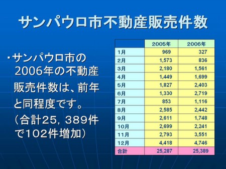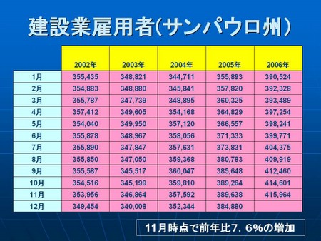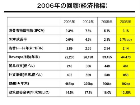 まず金融経済一般情勢と銀行業界の回顧でございますが、2006年はここ2年ほど順調に、経済規模を拡大してきたブラジルの経済がですね、国際経済の変動 という試練を経験しつも、いわゆる安定性といいますか、経済の底堅さ、これを実証した年だというふうに言えると思います。ここで主な経済指標、これを出し ておりますのでそっちを見ていきたいと思いますが、インフレ率ですね。これは堅実な金融政策もございまして、まあ3.14%と、中銀の目標値4.5%を大 幅に下回っています。一方、高金利、レアル高ということもございます。