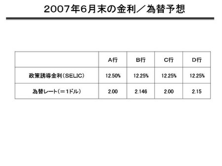 これだけで終わってはおもしろくないので、一応金融部会に 属する銀行さん4行さんにお願いして、今年 6月末時点でのSelicとレアルの対ドルレート、これを予想してもらいました。一応匿名ベースでございますけども、結果はこのシートの通りでございまし て、おおむねSelicは12.25から12.5、12.25というのが一番多いですね。それから為替レートは2.0から2.15、まあこのあたりにおさ まるのかなと。数値としてはそれほどサプライズがある数字ではございませんが、一応皆様のご参考に供したいと思います。