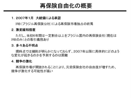 2007年の展望でございますが、今年も引き続き市場は拡大傾向にございます。さきほど申し上げました通り、リスクの大小によりまして、保険料率の格差も 拡大していくと考えられます。また、もう一つですね、大きなインパクトになりますのが、ブラジルの再保険市場の自由化という問題がございます。再保険とい いますのは、私ども保険会社が、さらにリスクヘッジするためにかける保険でして、まあロンドンやスイス、ミュンヘン、このあたりの大手の専門会社が有名な んですが、ここのブラジルではですね、半官半民のブラジル再保険公社と、イルビと呼んでおりますが、ここの一社独占になっております。