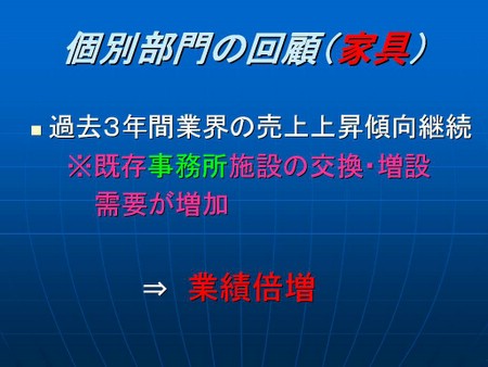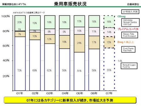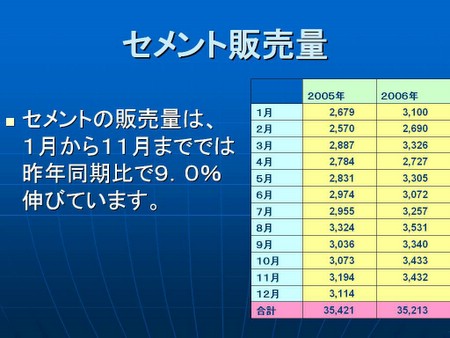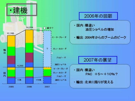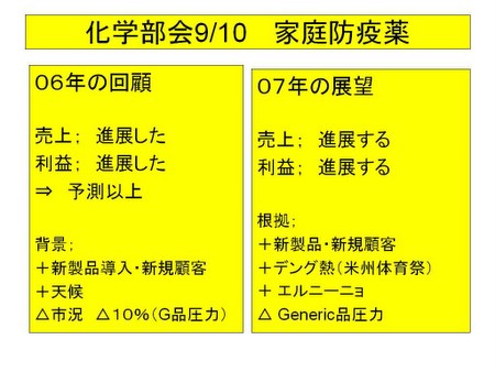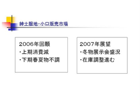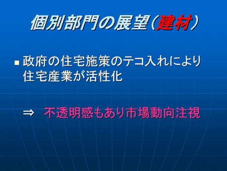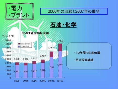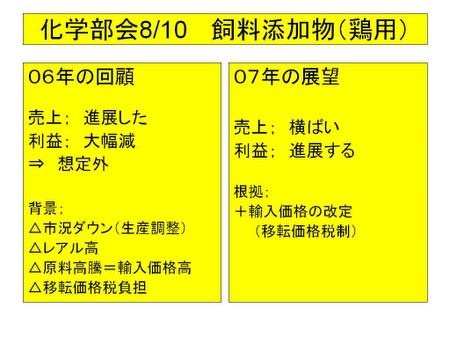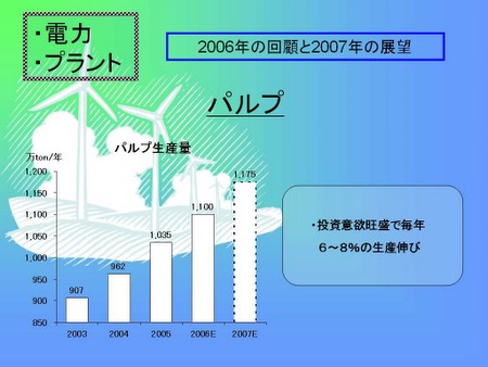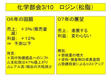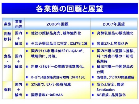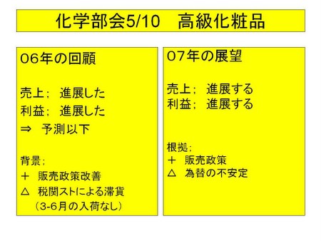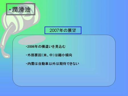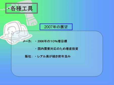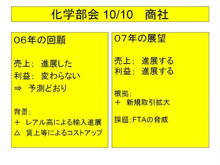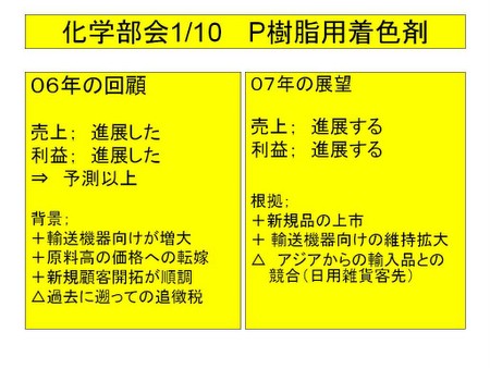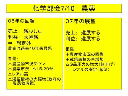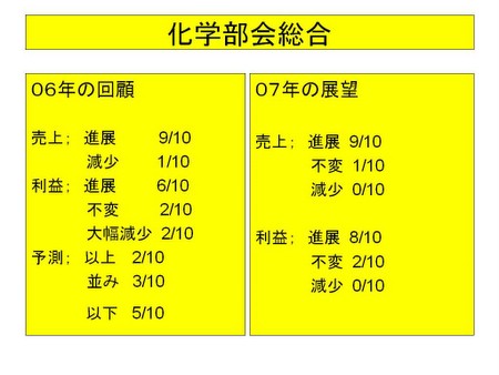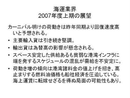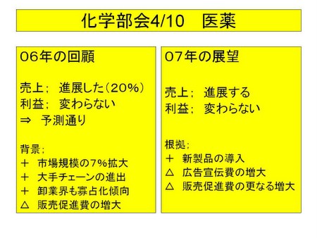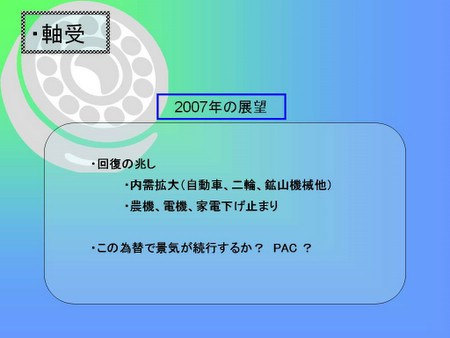 でまあ、07年、 銀行業界、ちょっと書いてございませんけども、金利は低下予想されるもののですね、堅調な経済動向、それから個人所得の改善、こういうものもございますの で、まあ預金は増加して貸し出しも期間の長期化ということで、総額では引き続き増えていくだろうということ。さらに不良債権の比率、これもですね、昨年相 当高くなったんですけども、今年は若干縮小するだろうという見込みでございますので、大手銀行にとっては引き続き、ある程度favorableな環境かな というふうには見ております。