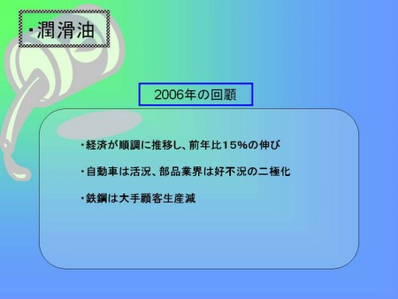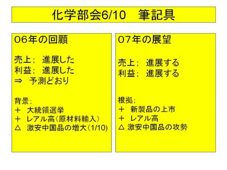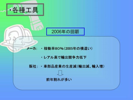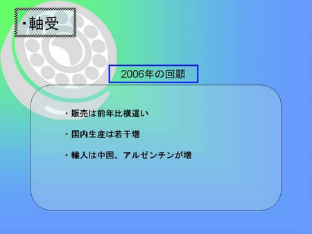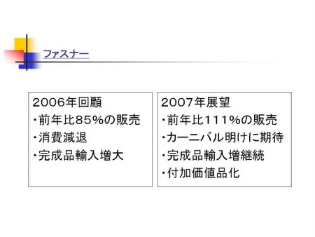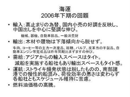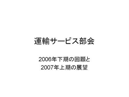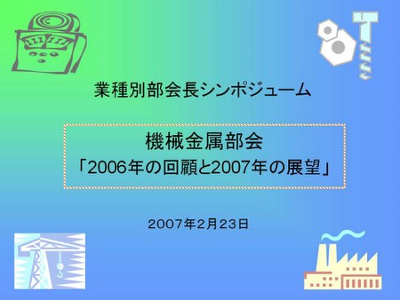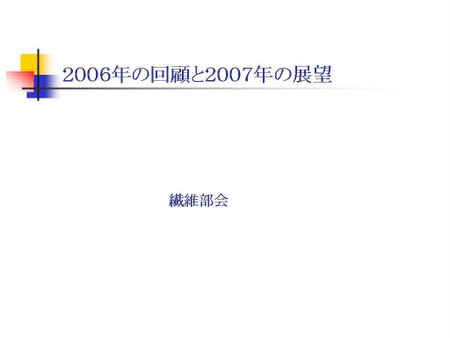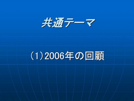 皆さんこんにちは。金融部会の南米安田保険、米倉でございます。時間の関係もございますんで、前置きなしで始めさせていただきたいと思います。2006年 の回顧と2007年の展望ということでお話しますが、金融経済情勢一般と銀行業界、それと保険業界。二つに分けてご説明させていただきます。