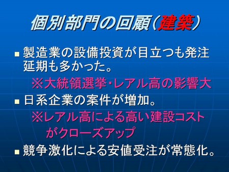 それ からSelicの金利、昨年末は13.25だったわけですけども、引き続きもちろん引き下げ傾向でございますが、まあインフレ抑制とこれが強くでておりま すので、やや緩やかなものになるという見込みで、年末時点では11・5%、これを見込むと。それから経済成長率でございますが、金利引下げ効果もございま すので、昨年の2・7%台、これよりは当然行くだろうということですが、当初の政府のシナリオ、4.5%ですか、これはとても無理で、まあ3.5%程度と そういう予測でございます。
