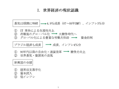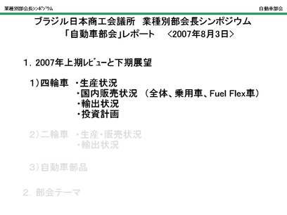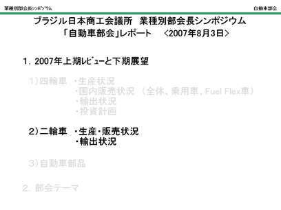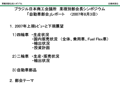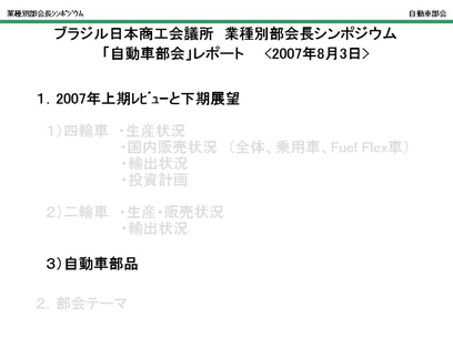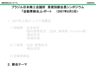 今日のメニューなんですけど、2つ です。まず移転価格税制の問題概要ということで、まず移転価格とはどんなことかというのを説明します。その次に、ブラジルの移転価格税制というのは世界的 に見るとちょっと特徴的な部分がございまして、それが問題そのものに直結している部分があるもんですから、これを簡単にご紹介します。その次に、この移転 価格税制をですね、まあブラジル移転価格税制を理解した上で、委員会活動、まあ商工会議所の活動として取り組んで何をめざすのかということを皆さんに知っ ていただくために、今までどんなことを活動してきたかということをご紹介して、今後の方向性ということでお話をします。じゃお願いします。