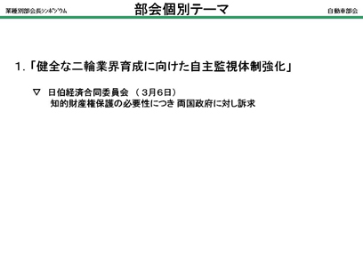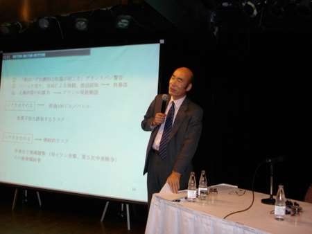 ということで今後の展開のアプローチなんですけども、こういう形でいろんな活動をやってきました。ただ非常に大きなヤマというふうに思っておりますので、 今後もあらゆるルートを通じて改善を訴え続けていくことが何よりも必要だろうということで。実際この場でこういう話をさせていただくということも、今まで やることは色々やってきたんだけども、こういうシンポジウムの場を使ってもですね、皆さんにこの辺の状況を理解していただいて。幸いこちらは、今日は皆さ ん各企業、団体の代表者の方が集まっていただいていますので、政府に対するコンタクト、接触の機会が色々あるんじゃないかというふうに思っております。
