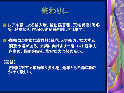 そ ういった機会を通じてですね、この活動を通じて今悩んでいること、課題として認識していることを是非ですね、訴えていただきたいというふうに考えておりま して、是非ですね、商工会議所のパワーを合わせて活動していくということで皆さんのご協力をお願いしたいというふうに考えております。ちょっと時間オー バーしてしまっていると思いますけど、申し訳ありませんでした。以上です。ありがとうございました。