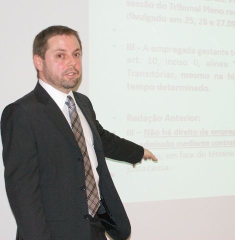Kanamaru Advogados弁護士事務所のカルロス・アレサンドロ・シュヴィンケル弁護士/労働法部門コーディネーターが「労働最高裁判所 判例要旨244号 と 378号の変更点 - 2012年9月28日施行 」について、雇用契約期間内の妊婦の雇用保護について、妊産婦が母体保護のために出産後においてとる休暇期間は120日でその間のサラリー等の支給は保障されており、また妊娠確認から出産後5カ月間は解雇できないと説明した。