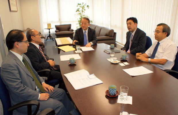 異業種交流委員会の江上知剛委員長、板垣勝秀氏(パナメジカル)、櫻井淳氏(伯国三菱商事会社)が2013年1月10日に商工会議所を訪問、平田藤義事務局長、日下野成次総務担当と今年の異業種交流委員会活動について意見交換を行った。