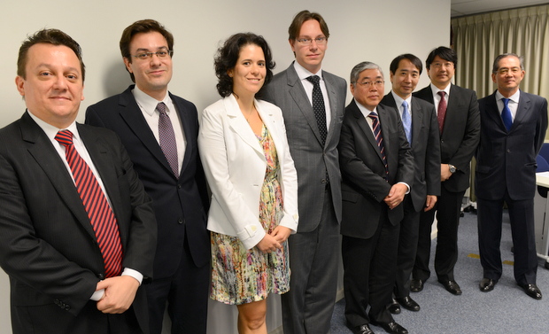 左から講演者のPwC Brasilのマルセル・コルデイロ税部門共営者/Pinheiro Neto Advogadosのラファエル・ビスポ税制部門シニア弁護士/Trench, Rossi e Watanabe Advogados アソシエートのプリシーラ・ファリセリ税務訴訟弁護士/Kanamaru Advogadosのルイス・エンリケ・バセテ 税部門責任者/司会のアキラ・ニシカワ氏/村上 廣高委員長/佐々木リカルド副委員長/篠原一宇副委員長
