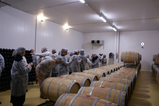27日にはホテルで朝食後、ラージェス市から90キロ離れたブラジルでも数少ない雪が降る町として知られているサンジョアキン市へ。サンジョアキン農業協同組合(SANJO)では清水信良理事長、マサト・タカシカ副理事長、ロベルト・ヤスシ・カトウ財務部長、ヴォウネイ・フランシスコ・ブックハウザー・ジュニア アグリビジネス部門マネジャーに迎えられ、応接スペースにて紹介ビデオを上映後、敷地内見学へと向かった。コチア産業組合解散後、1993年に組合員たちが自ら出資し立ち上げられたSANJOは当初1万5千トンのリンゴ生産、現在は4万トンのリンゴ生産している。フランスから取り入れた最新鋭の機械により洗浄、選別などが行われる。洗浄用の水は1年間同じ水を再利用できる技術を導入しているなど環境保護にも取り組んでいる。一方ワインは発酵、熟成(樫樽とステンレスタンク)、瓶詰め、倉庫などの設備を見学した。最後に試飲ルームへ案内され、サンパウロ市で毎年行われるワイン国際見本市Expovinisで「トップテン2012」の国内白ワイン部門で優秀賞に輝いたMaestrale Integrusをはじめ、ロゼ、赤ワイン、リンゴで作る蒸留酒などまろやかな味から濃いものまでを試飲する事が出来た。帰りの際、同組合の売店にはサンパウロでは未だあまり普及していないSANJOワイン等を購入する参加者らが殺到した。