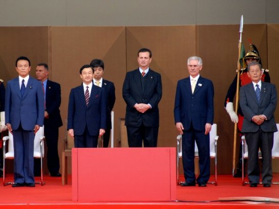 左前列から麻生太郎日本ブラジル交流年実行委員会名誉会長(日伯議員連盟会長)、ご臨席された皇太子殿下、カサビ市長