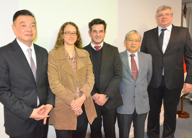 左から破入マルコス副委員長/Abe, Guimarães e Rocha Neto Advogadosのプリシーラ・モレイラ弁護士/ジョージ・ヌーネス氏/山内正直副委員長/Ferreira Rodrigues Sociedade de Advogados のジューリオ・ジョゼ・.タマジウナス弁護士