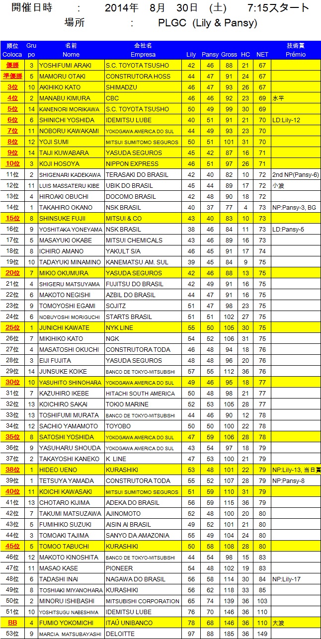 2014年8月30日(土)、第33回カマラゴルフ大会がサンパウロPLゴルフクラブで盛大に開催されました。今回は53名の皆様のご参加を頂き、表彰式も大盛況の内に終了いたしました。
