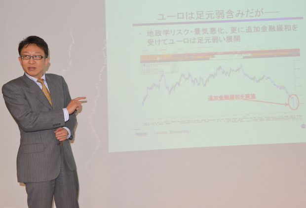 講演中のみずほ銀行の柴田 保之米州資金部部長