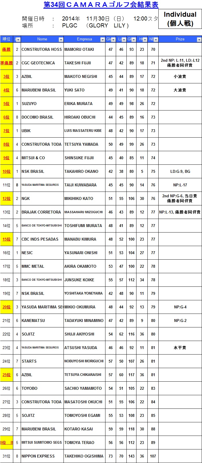 2014年11月30日(日)、第34回カマラゴルフ大会がサンパウロPLゴルフクラブで盛大に開催されました。今回は31名の皆様のご参加を頂き、表彰式も大盛況の内に終了いたしました。