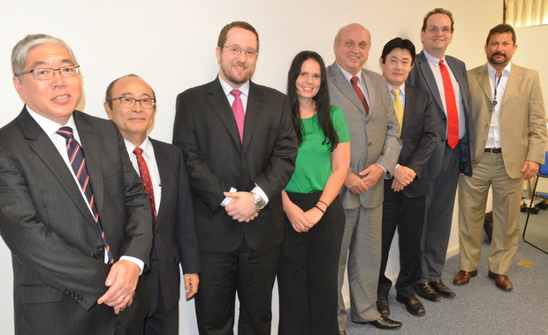 左から西川アキラ副委員長/平田藤義事務局長/PwC .のオランド・ダルシーニ 間接税担当部長/Honda Estevão Advogadosのアナ・カロリーナ・メイラシニア弁護士/同レイナルド・トミアッテ シニアコンサルタント/矢野クラウジオ副委員長/Trench, Rossi e Watanabe Advogados のダヴィ・デ・パイヴァ・タンジェリーノ共営者/ジョゼ・デ・カルバーリョ氏
