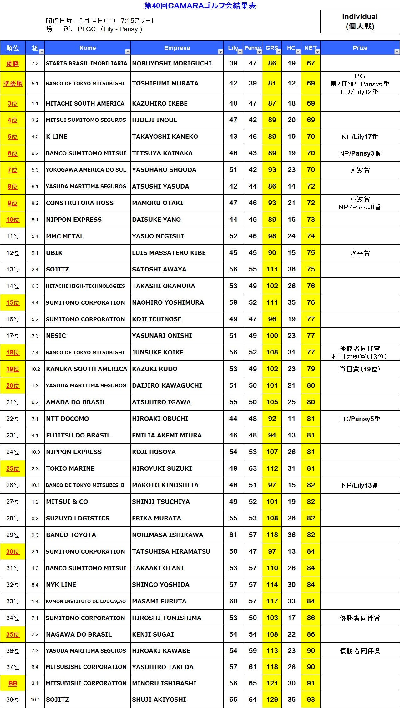 優勝は森口様(Starts社)がLILY39・PANSY47、HC19、NET67のスコアで獲得、2位には村田様(Tokyo-Mitsubishi UFJ銀行)、3位には池辺様(Hitachi South America社)が入りました。