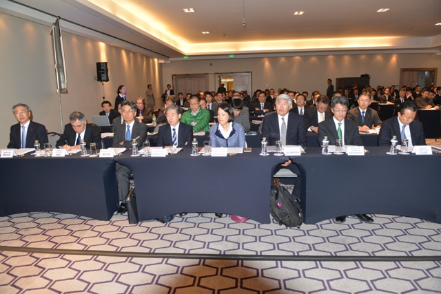 コーヒーブレークを挟んで、初めに電気電子部会の磯村恵次郎副部会長(EPSON)は、為替変動による業界への影響やマナウスフリーゾーンの現状、化学品部会の中村 博部会長(久光製薬)は、国内市場低迷による周辺諸国への活路での打開、食品部会の藤江太郎部会長(味の素)は消費者動向を見据えた商品開発や市場開拓、運輸サービス部会の 細谷浩司部会長(日本通運)は為替変動に左右される旅行業界、憂慮されるオリンピック終了後のホテル業界、建設不動産部会の 藤井 健部会長(CGC)は失業率が高い時の優秀な人材確保チャンスや日本の優秀な技術で対抗できる欧米企業のM&A、繊維部会の南村幸彦部会長(東洋紡)は、大きなマンパワーを維持するブラジル繊維工業やブラジルコスト削減の重要性などについて、部会を代表して発表した。