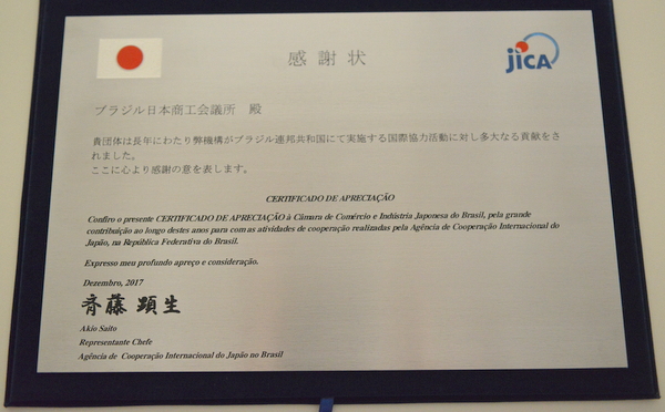 平田藤義事務局長は2017年12月9日にJICAサンパウロ出張所で開催された日本語学校生研修30周年記念式典に参加、この記念式典は2018年1月から2月にかけて派遣される31回目の研修参加者のオリエンテーションを兼ねて開催された。1987年に9人の中学生が中南米4カ国から日本で研修して30年が経過。JICAブラジル事務所の斉藤顕生所長が開催挨拶、ブラジル日本文化福祉協会の呉屋春美会長並びに野口泰在サンパウロ日本国総領事が来賓挨拶、第1回研修生をはじめ10回生、20回生、30回生代表がそれぞれ挨拶した。平田藤義事務局長は、会議所がブラジル連邦共和国にて実施する国際協力活動の貢献に対する感謝状の記念プレートを受け取った。