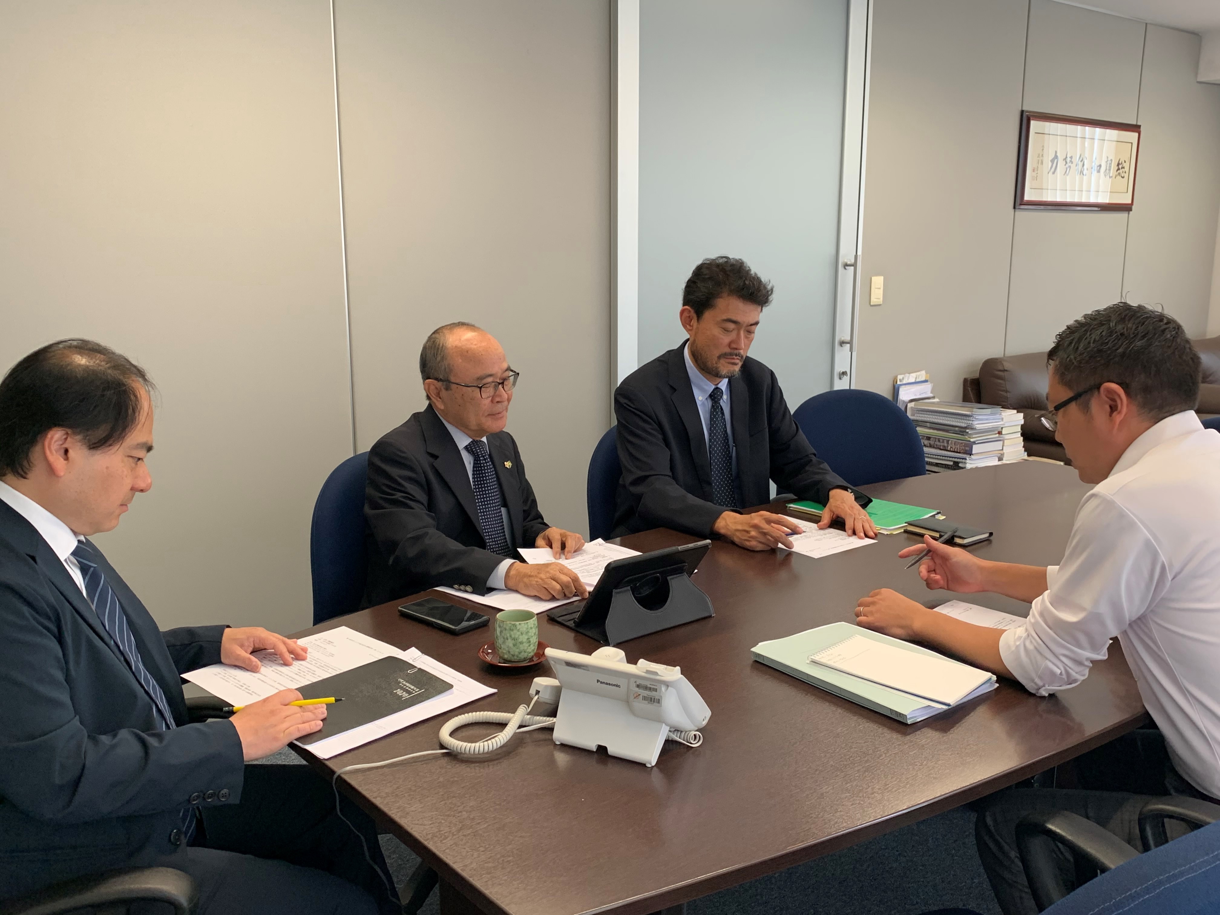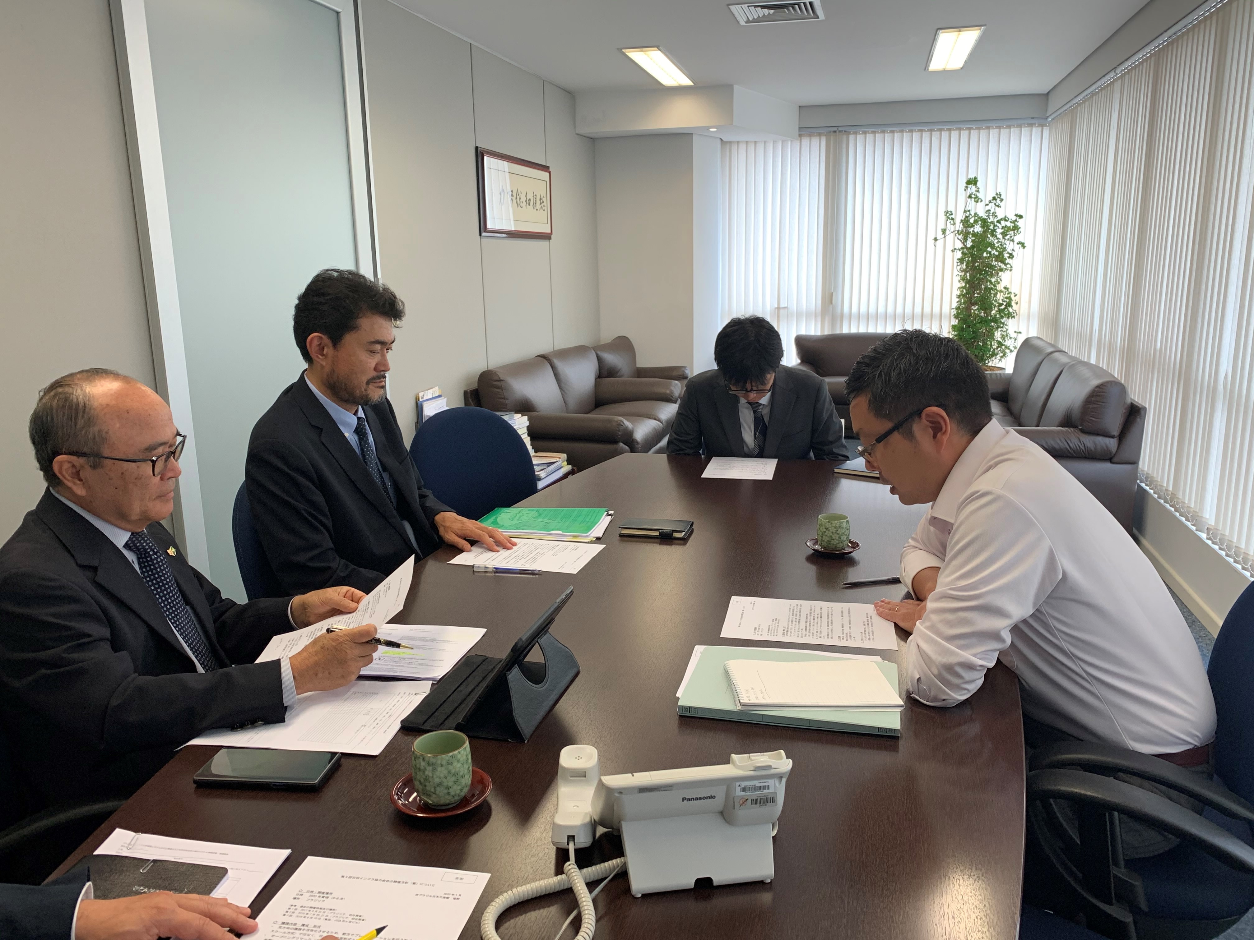 左から日下野成次総務担当/平田藤義事務局長/佐藤洋史インフラワーキンググループ長(JICAブラジル)/在ブラジル日本国大使館経済班の塩野 進一等書記官