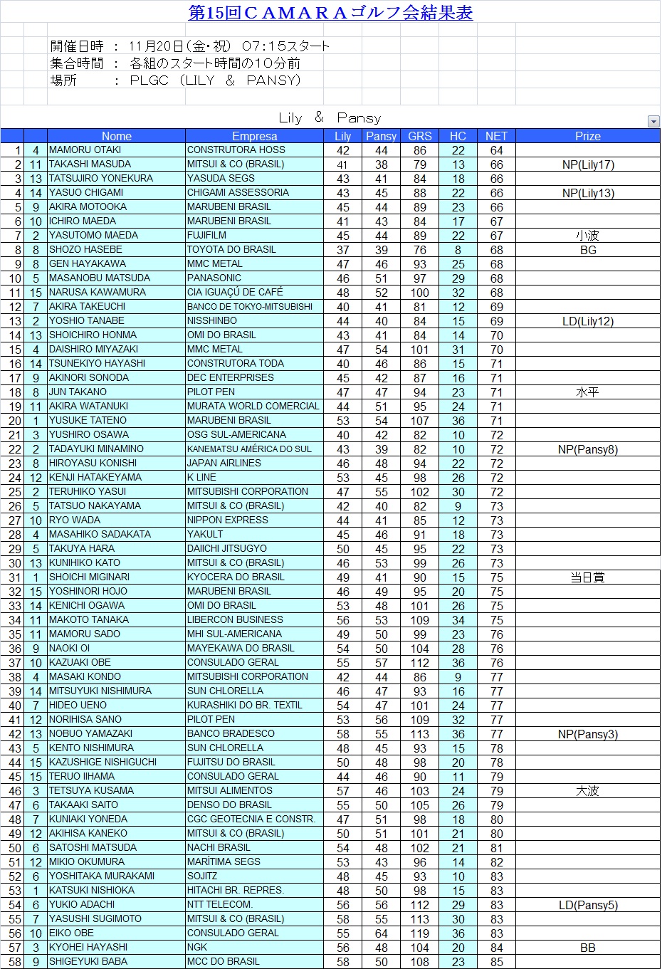 11月20日(金・祝)に今年度最後となる第15回カマラゴルフ会がPLゴルフ場で開催されました。当日は好天に恵まれ、第一組が7時15分にスタート。特別ゲストとして大部総領事御夫妻のご参加をいただきました。総勢58名の参加者で競技が行われ、大盛況のうちに終了いたしました。