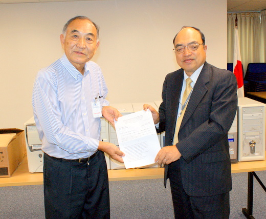 左は目録を受取る子供の園のジョゼ・タニグチ理事長/寄贈する米倉立二郎財務委員長 (fotos Rubens Ito/CCIBJ)
