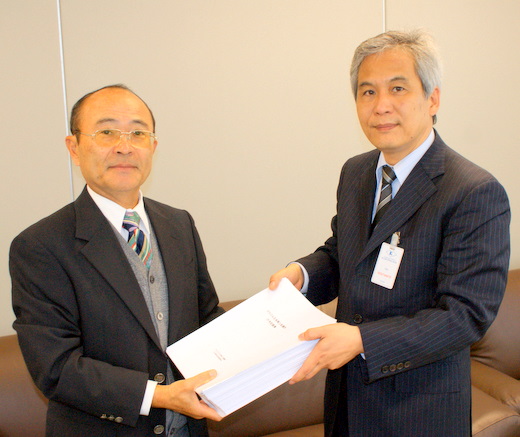 左から600ページに及ぶ70周年記念集のドラフト改訂版を受取る平田藤義事務局長/手渡す鈴木雅夫社長 (fotos Rubens Ito/CCIBJ)