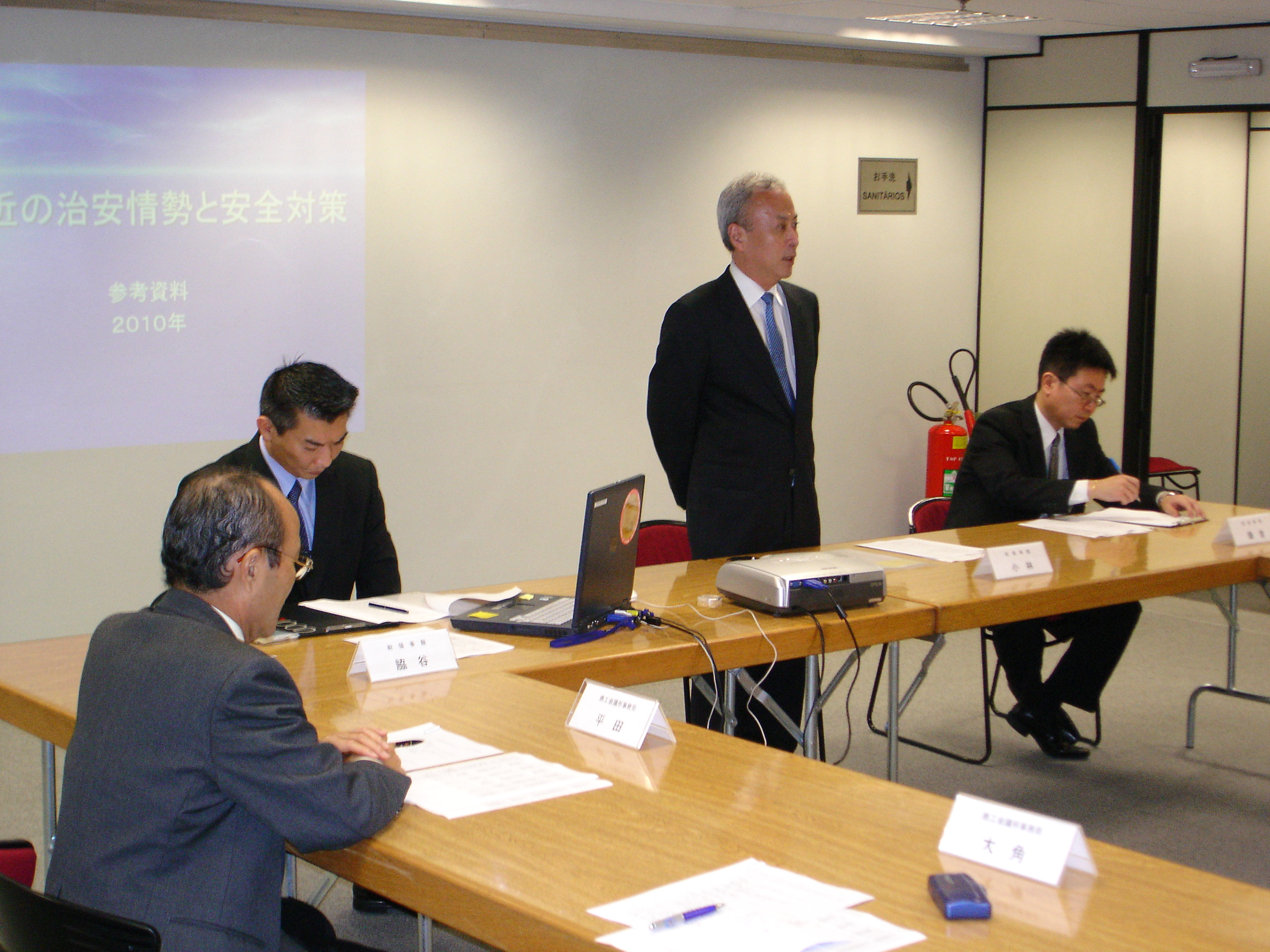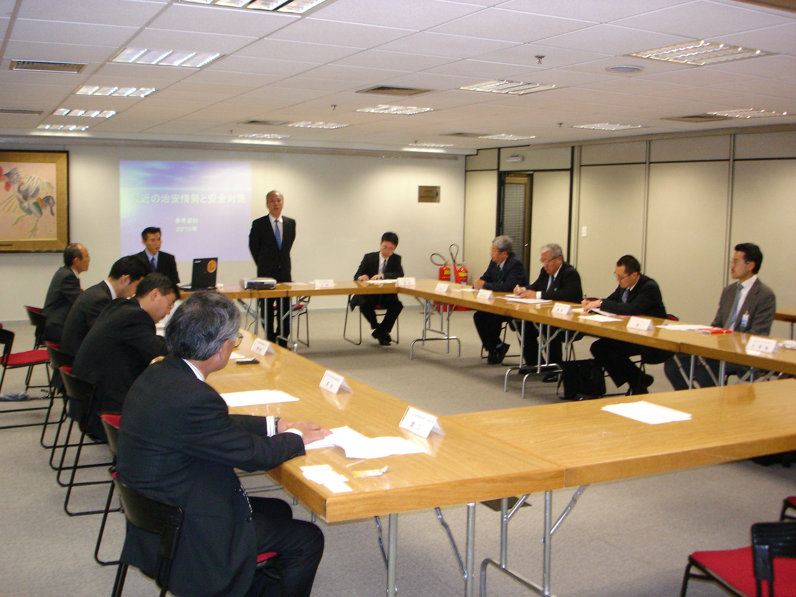 当日の参加者は15人、商工会議所からは総務委員会(近藤正樹委員長)の安全対策チームメンバーの塩原優氏(伯国三菱商事会社)、原宏氏(ジェトロ)、唐木田光男氏(三井住友銀行)、平田藤義事務局長