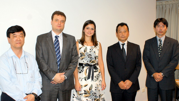 左から司会のアメリコ・アラサキ氏/講師のMIGUEL NETO ADVOGADOS ASSOCIADOSのロベルト・デ・パヅア・コジニ・パートナー/VEIRANO ADVOGADOSのクリスティーナ・デカストロ・フランシ弁護士/上野秀雄委員長/司会のワシントン平瀬福委員長