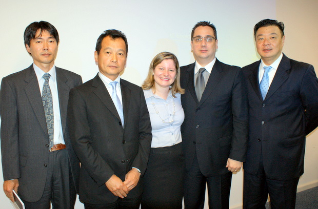 左から平瀬ワシントン副委員長/上野秀雄委員長/KPMGのレジーナ・モラエス社会保障部門スーパーバイザー/Manhães Moreira Adovogadosのフェルナンド・ヴィエイラ・シニアパートナー/マルコス破入副委員長(fotos Rubens Ito/CCIBJ)