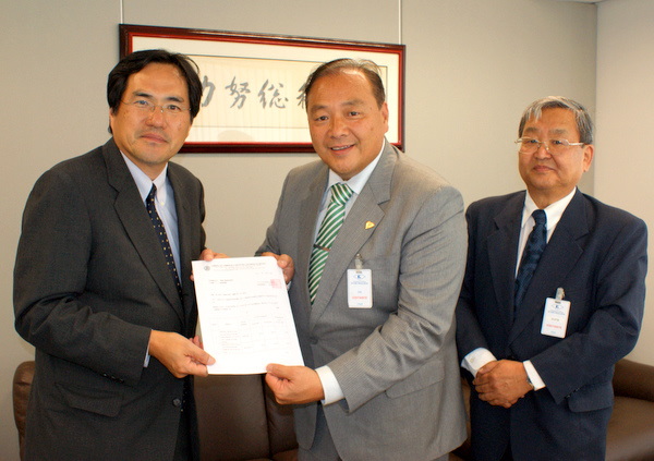 社会福祉法人 希望の家福祉協会(上村恵ジャイロ理事長)への22台の会議机譲渡式が2011年12月19日午後3時から会議所会議室で開催、村田俊典財務委員長から上村恵ジャイロ理事長に目録が渡され、同協会の大野孔三第一副理事長、会議所からは平田藤義事務局長も出席した。