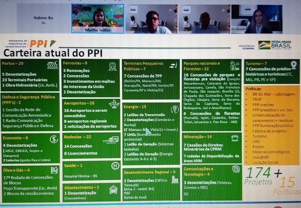 初めにMartha Seillier特別長官は、PPIのハブ効果の機能、ブラジルの経済成長加速するために不可欠な年金・恩給改革、行政改革、税制改革並びにインフレ整備。民営化に関する法案、入札実施プロジェクト件数及びボーナス総額、2019年のPPIの39件入札、2020年は29件の入札実施、2021年は既に30件実施、COVID-19パンデミックのPPI入札への影響、実施予定の港湾、空港、石油・天然ガス、道路、上下水道、5G並びに電力エネルギ―関連入札、郵便公社を含む今後入札予定の公社リスト及びスケジュールなどについて説明した。