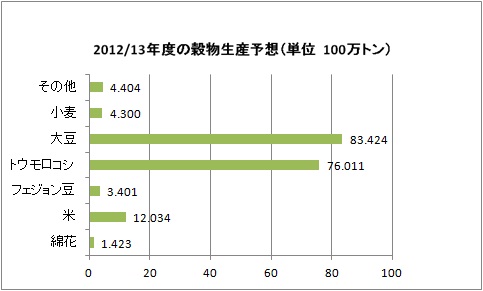 またConab公社では、2012/13年度の大豆生産は前年比約1.0%増加に相当する74万5,000トン増加の8,342万2,000トンを予想、ブラジル地理統計院(IBGE)の2012/13年度の穀物生産は、1億8,330万トンを予想している。(2013年2月8日付けヴァロール紙)