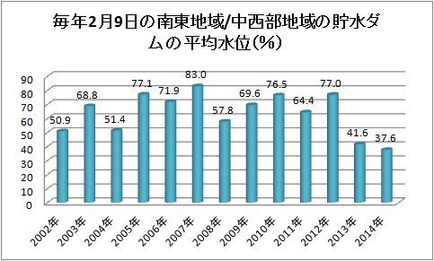 南東地域/中西部地域の水力発電所の貯水量は全国の70%を占めるが、1日平均の水位減少は0.2%に相当、2月は2.7%の水位の低下につながっており、今後降雨がなければ危険な水位に達すると予想されている。