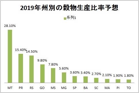 州別の今年の穀物生産予想では、マット・グロッソ州は全体の28.1%で断トツ、2位はパラナ州15.4%、南大河州14.5%、ゴイアス州9.8%、南マット・グロッソ州7.8%、ミナス州5.6%、サンパウロ州3.6%、サンタ・カタリーナ州2.7%、穀物生産フロンティアのマトピバを形成するバイア州3.4%、マラニョン州2.1%、ピアウイ州1.9%、トカンチンス州は1.8%が予想されている。