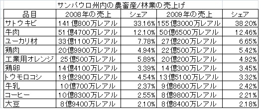 サトウキビ生産は栽培面積が前年比2.93%増加の4億340万ヘクタールに増加して売上げは前年比10.08%増加の155万3,000万レアルを予想、農産物全体の38.20%と前年の33.16%から大幅にシェアを伸ばしている。