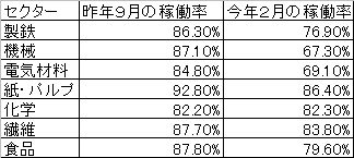 2月の設備稼働率は76.9%で設備投資が検討される78%から80%に達していないために、上半期の設備投資は実施されないと見込んでおり、製鉄部門の稼働率は67.3%、機械部門は67.9%と大幅に落込んでいる。