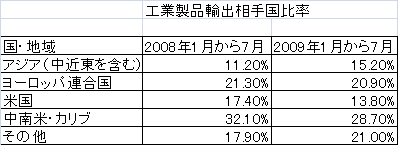 下半期の工業製品輸出は439億ドル、今年1年では前年比30.7%減少の830億ドル、アジア並びに中近東向け輸出は3.9%減少と僅かな落ち込みとなっている。(2009年10月14日付けエスタード紙)