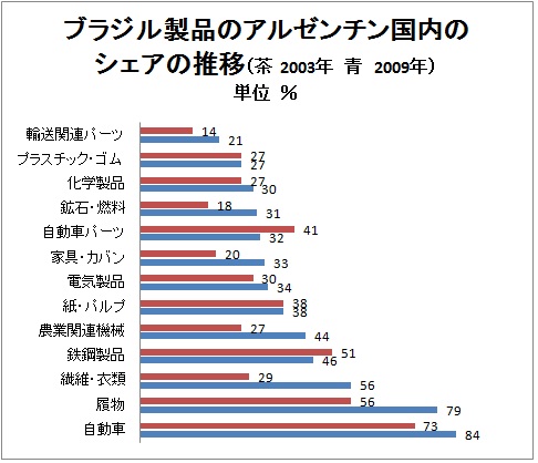 2003年から2009年のブラジル製品のアルゼンチンのマーケットシェアは34%から30%に低下、履物のシェアは79%から56%、繊維・衣類は57%から29%、電気・電子製品は34%から30%とそれぞれシェアを落としている。