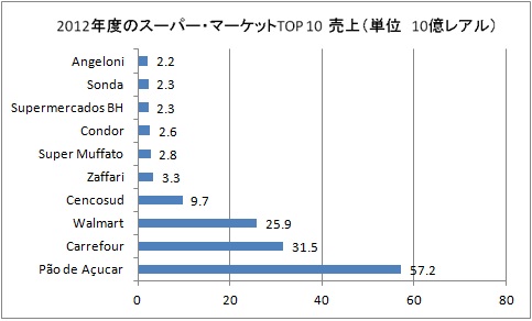 昨年のスーパー・マーケット業界の売上トップは、パン・デ・アスーカルで実質売上が8.6%増加の572億レアルを記録、2位はCarrefour で9.4%増加の314億レアル、3位はWalmartで10.5%増加の259億レアルを記録している。