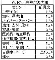 10月の自動車・パーツ販売は前月比マイナス15.8%、建材は前月のマイナス1.2%から一転して0.8%の増加,医薬品・衛生用品2.5%、繊維・衣類・履物は1.9%それぞれ増加している。